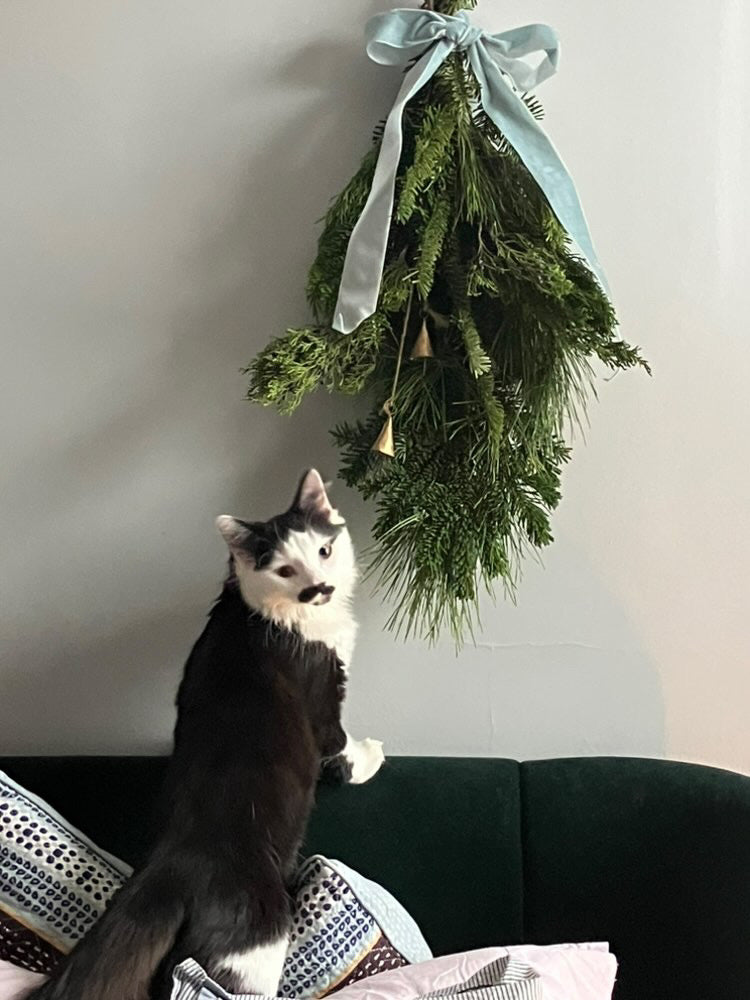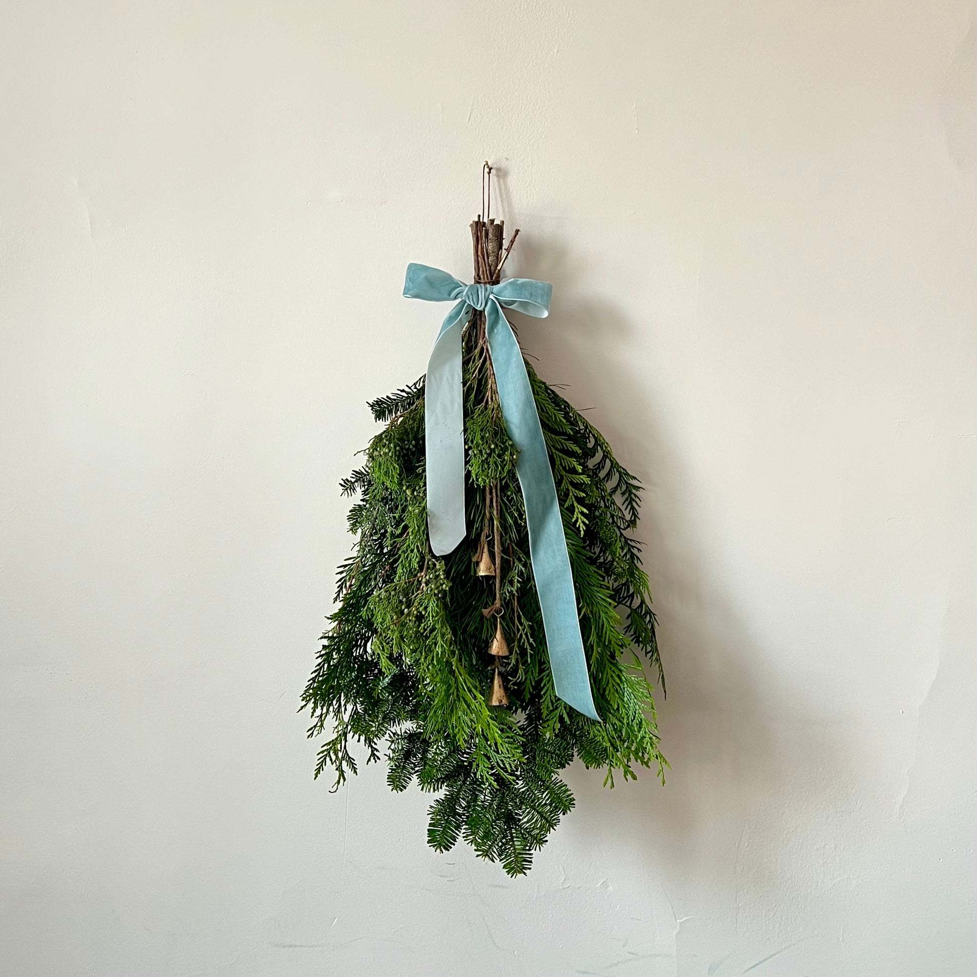 A bundle of fresh, fragrant winter greens tied with a velvet bow and adorned with bells, ready for hanging. Customize by choosing your ribbon colour below.